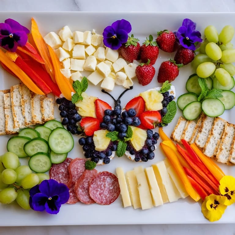 Save to Pinterest A vibrant and whimsical grazing board inspired by summer, featuring fresh fruits, cheeses, charcuterie, and edible flowers artfully arranged in butterfly shapes—perfect for picnics and gatherings.