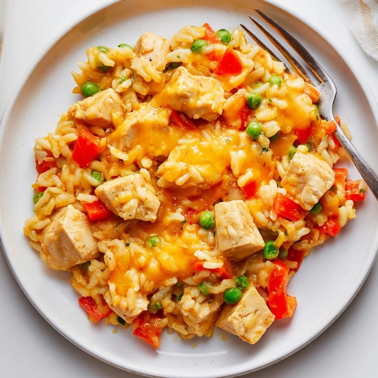 Save to Pinterest This comforting one-pot cheesy chicken and rice is the answer when you want a filling meal with little fuss. Juicy chicken, fluffy rice, sweet carrots, and colorful bell peppers all come together under a blanket of melty cheddar—everything merges in one pot for unbeatable flavor and easy cleanup.