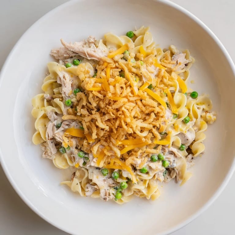 Save to Pinterest A comforting classic casserole featuring tender egg noodles, savory tuna, and a rich creamy sauce, all topped with golden crispy onions for irresistible crunch.