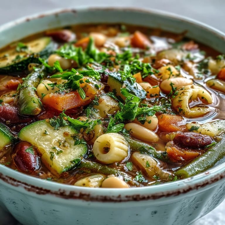 Save to Pinterest My neighbor Maria taught me that minestrone isn't just soup—it's a conversation between what's in your garden and what's in your pantry. She'd make it on cool afternoons, humming while she chopped vegetables with this rhythmic, meditative patience that made the whole kitchen smell like home. The first time I watched her work, I realized she never followed a recipe; she just knew, somehow, that this combination of tomatoes, beans, and pasta could transform an ordinary Tuesday into something worth gathering around.