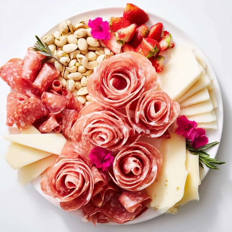 Save to Pinterest A stunning charcuterie centerpiece featuring savory meats and artisan cheeses arranged in elegant rose shapes, complemented by fresh fruits, nuts, and accompaniments. Perfect for gatherings or special occasions.
