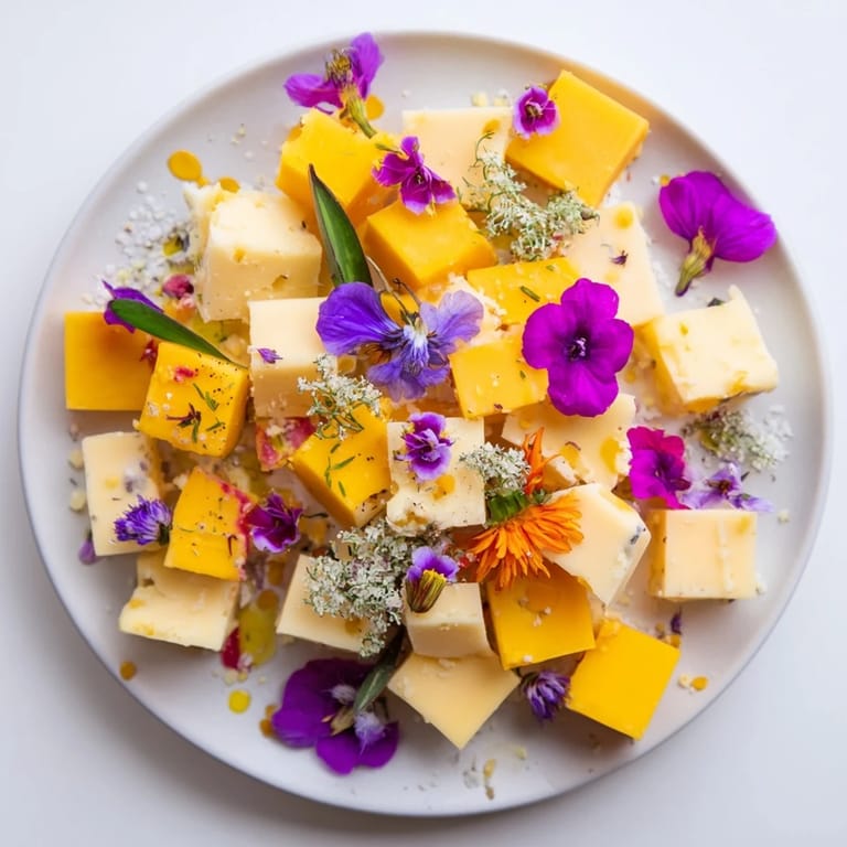 Save to Pinterest I discovered this dish accidentally one spring when my mother-in-law arrived unannounced with a basket of edible flowers from her garden. I had aged cheddar, creamy goat cheese, and nutty Gruyère on hand, but nothing felt quite right for the moment. Then it clicked: what if the cheese wasn't the centerpiece, but the secret? I spent the next hour arranging those golden and white cubes across a board, then burying them under waves of delicate microgreens and vibrant blossoms. When she saw it, she actually gasped.