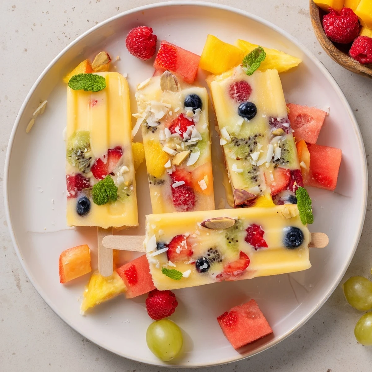 - 6. Surround popsicles with fresh fruit cubes, grapes, and mango.