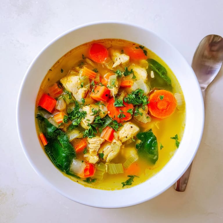 This soup combines lean protein with vegetables and turmeric's anti-inflammatory properties. Each serving provides 29g of protein with only 230 calories. The black pepper added enhances turmeric absorption, maximizing its beneficial compounds while keeping the dish light yet satisfying.